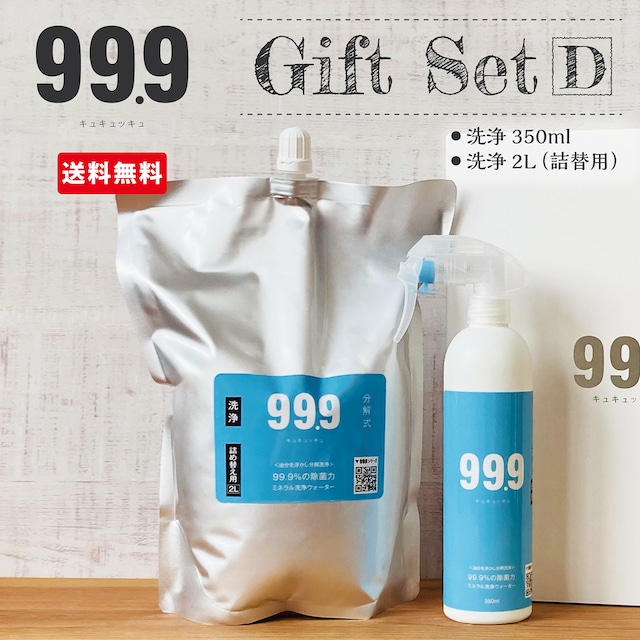 99.9ギフトセットD【ミネラル洗浄ウォーター350㎖ボトル+2ℓ詰替用セット】<送料無料> 洗浄ギフトボックス 母の日 お中元 お歳暮 掃除 車内 天然成分100%
