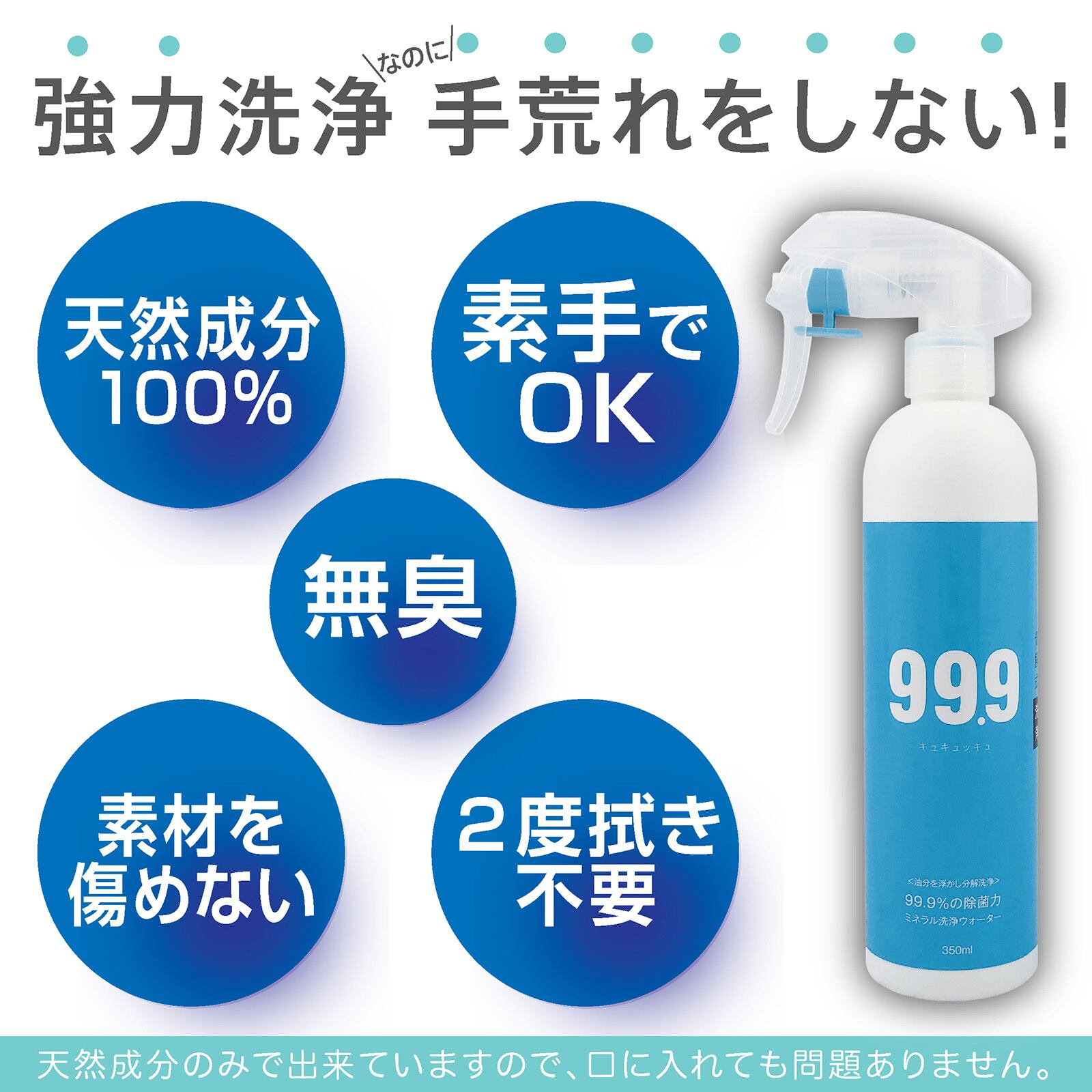 99.9洗浄は、天然ミネラル、純水(精製水)、植物抽出液のみでできているため、環境に悪いものが一切入っていないだけでなく、油汚れなどを天然ミネラルの浄化作用で分解するので、排水に流れても環境を汚す心配がありません。