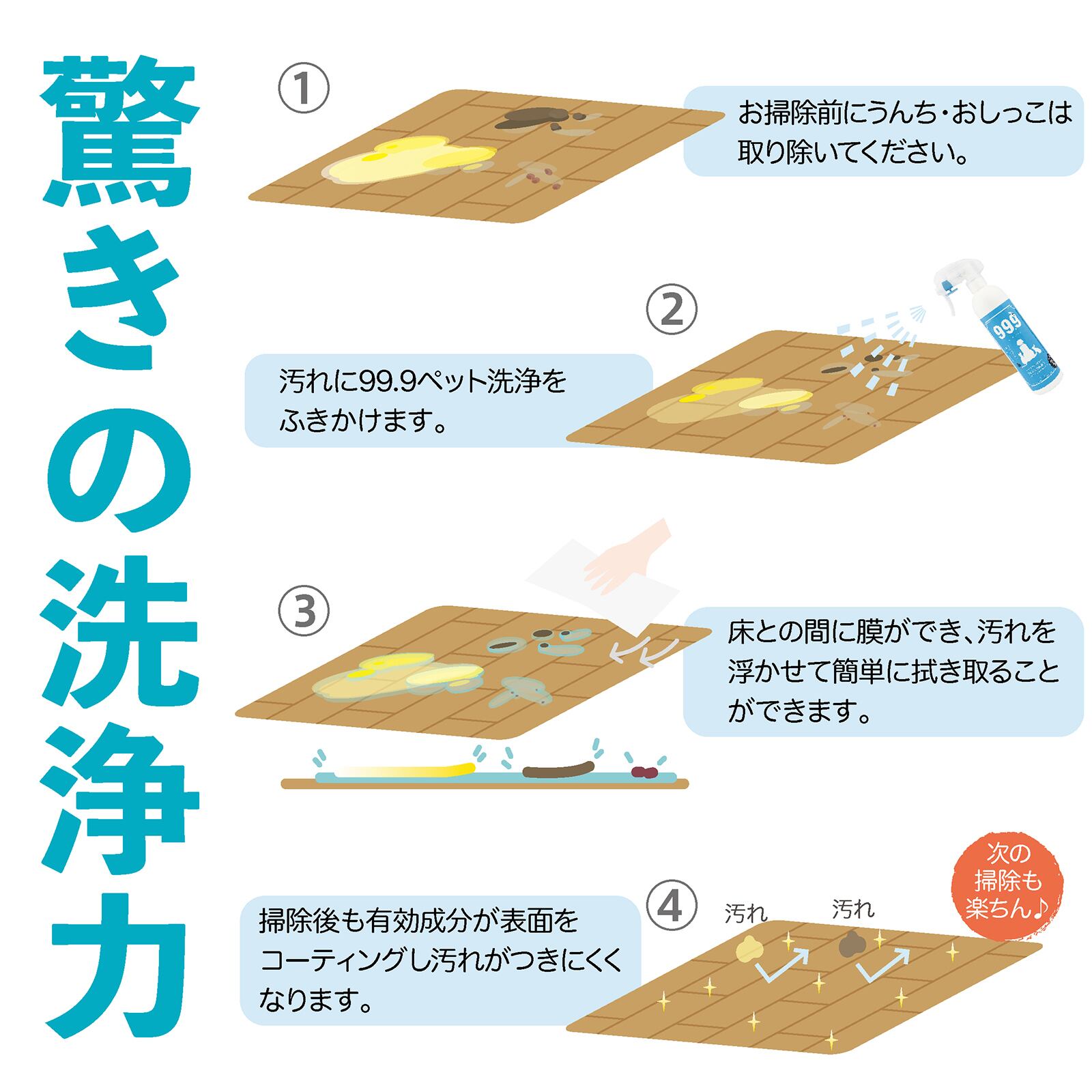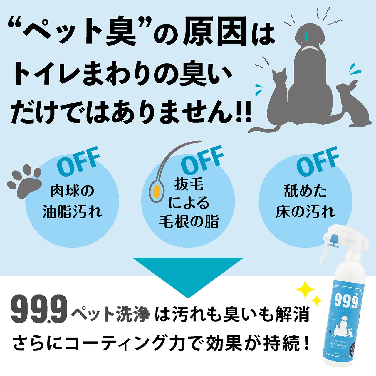 拭き取るだけでは汚れ(雑菌)は取り除けていません。99.9ペット用洗浄は、天然のミネラル成分が雑菌や汚れを浮かすので楽に取り除くことができ、さらに有効成分がコーティングされるので次に付着した汚れが除去しやすくなります。