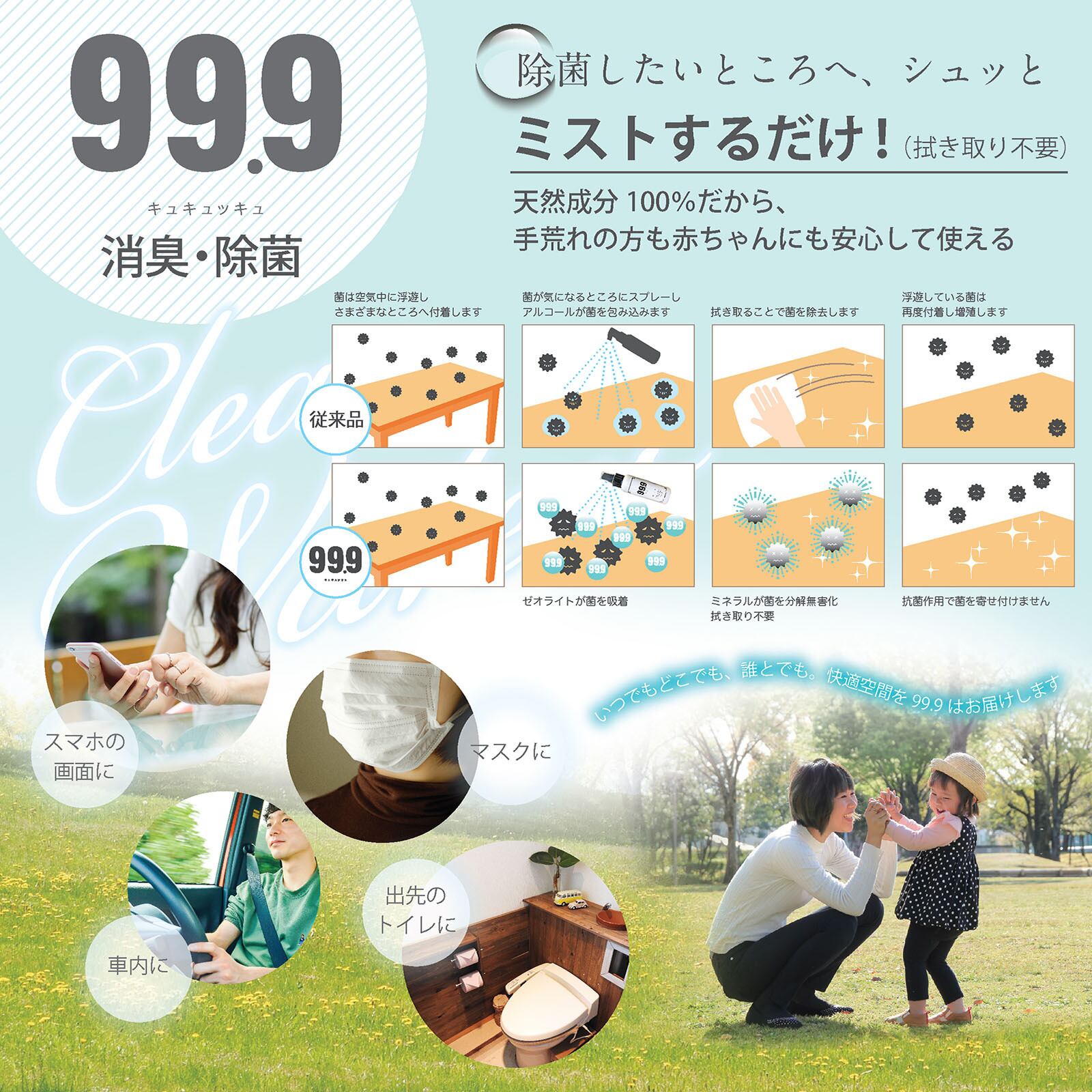 多くの除菌消臭剤は化学物質を含んでおり、人体やペット、地球環境などに悪い影響を及ぼす危険性があります。99.9消臭・除菌の成分は、日本山中で発掘される天然ミネラルと純水(精製水)のみです。天然ミネラルには浄化作用があり、ニオイの元を分解し消臭・除菌する効果があります。
