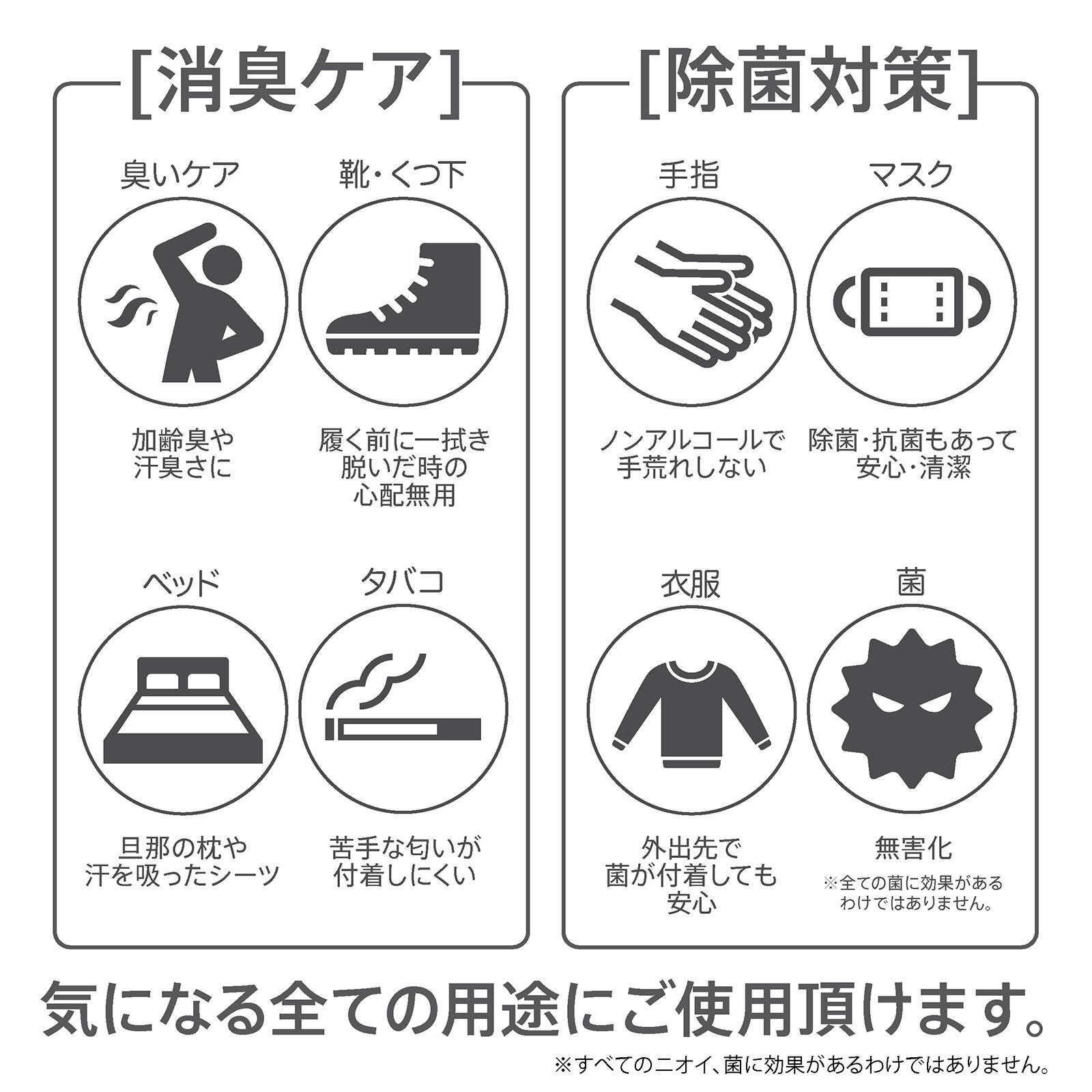 用 途:外出時等の携帯用消臭・除菌スプレー 衣類・髪・ドアノブ・スマホ・便座・お箸など消臭・除菌したいモノ