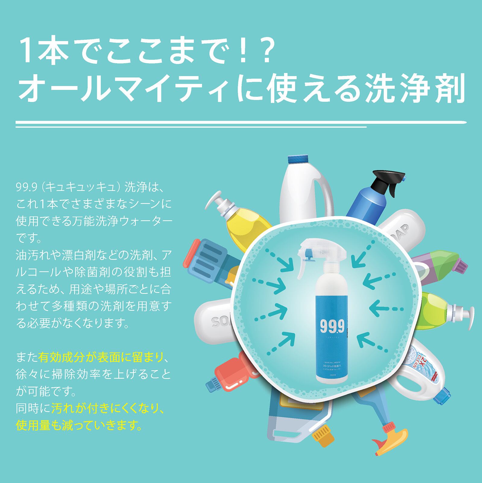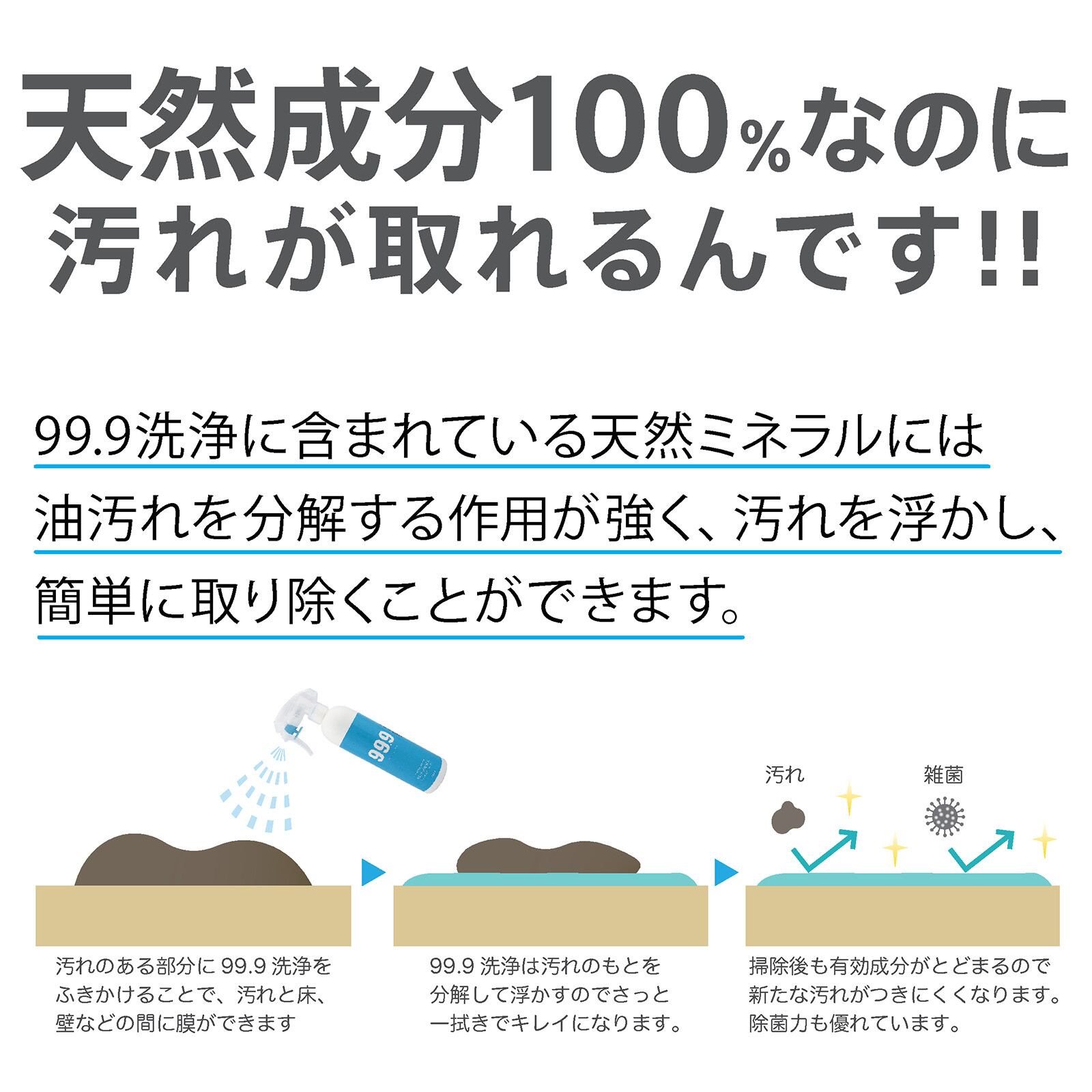 99.9洗浄は、天然ミネラル、純水(精製水)、植物抽出液のみでできているため、環境に悪いものが一切入っていないだけでなく、油汚れなどを天然ミネラルの浄化作用で分解するので、排水に流れても環境を汚す心配がありません。